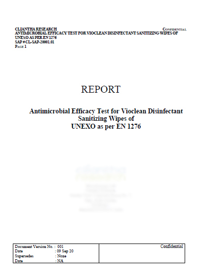 Our product Vioclean – Disinfecting Sanitizing Wipes are tested for their anti-microbial effectiveness according to EN1276 protocol wherein the wipes have been demonstrated to kill 99.99% of most common illness causing microbes.