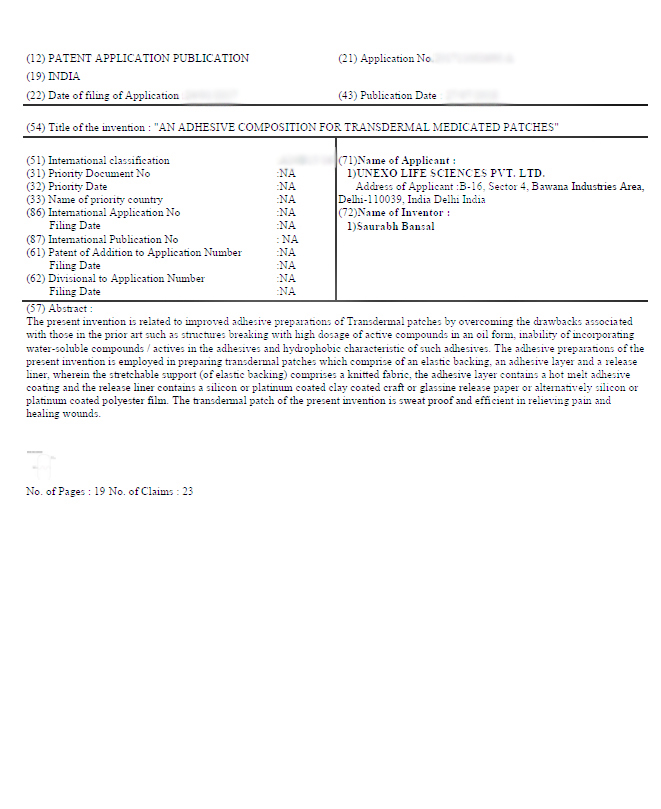 Our patches make use of a proprietary and custom developed formulation and manufacturing process. The filed patent for the above has been published by OFFICIAL JOURNAL OF THE PATENT OFFICE.